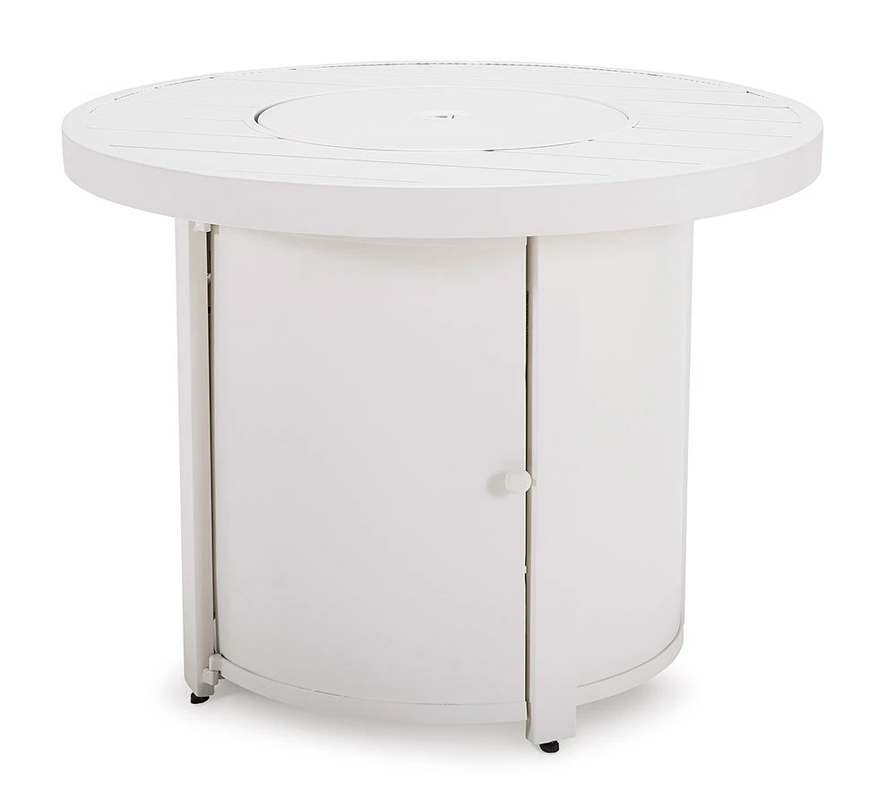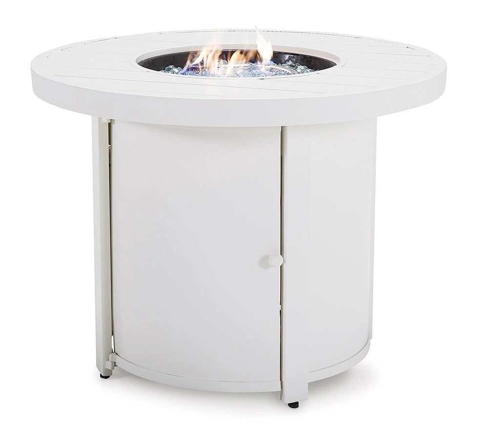 - OverviewAdd cottage-quaint charm to your outdoor oasis with this slatted Sundown Treasure Fire Pit Table by Signature Design. It’s crafted from durable, weather-resistant aluminum for years of enjoyment. The stainless steel burner conveniently ignites at the push of a button. It includes a burner cover that converts the fire pit into a coffee table, making it perfect for a variety of occasions.