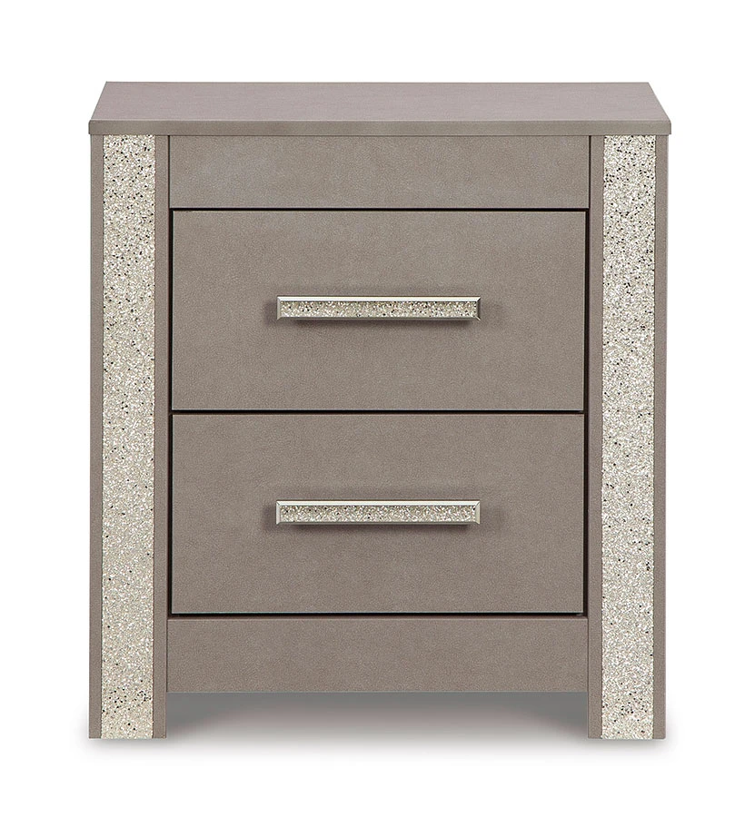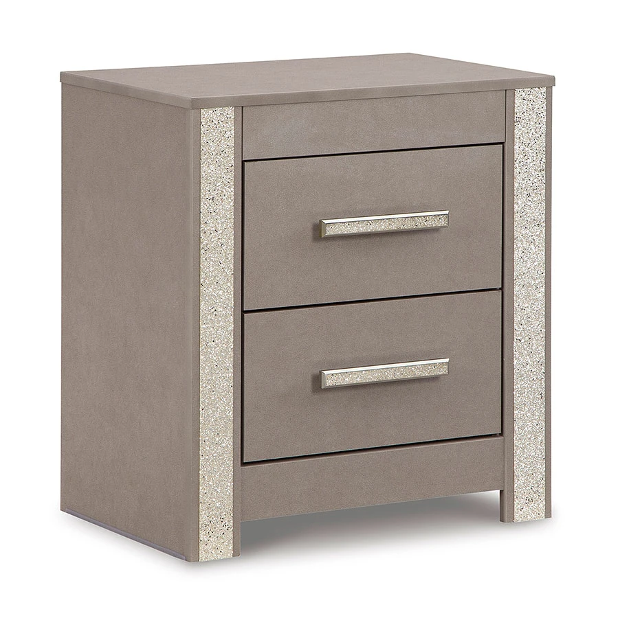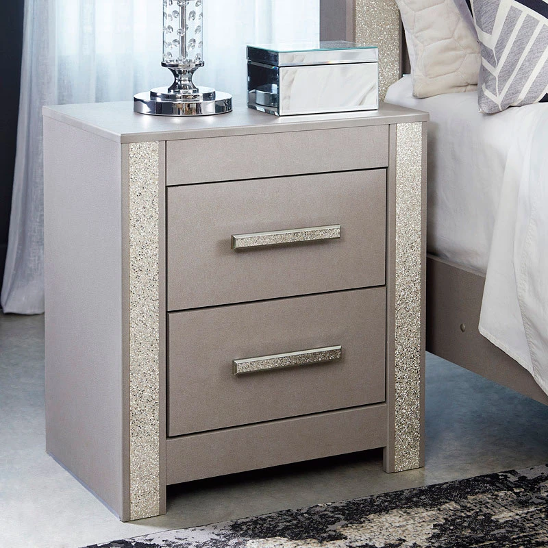 - OverviewLove sleek and bold contemporary style? Drink in the beauty of this Surancha nightstand by Signature Design. Its eye-catching details include glam glitter accents and the look of leather grain with a subtle gray finish. Large-scale linear handles, in a sophisticated champagne chrome tone, play perfectly with the streamlined aesthetic. This bedside piece is a simply stunning way to achieve the bedroom of your dreams.