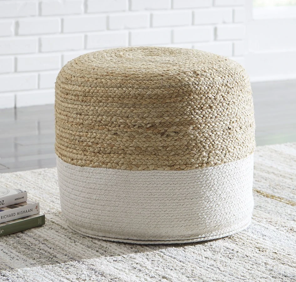 - OverviewNatural beauty is always in vogue, and the Sweed Valley pouf by Signature Design proves it. Braided design in natural jute hue and white is simple yet fresh. Stylish stitching and dense filling hold the look together.
