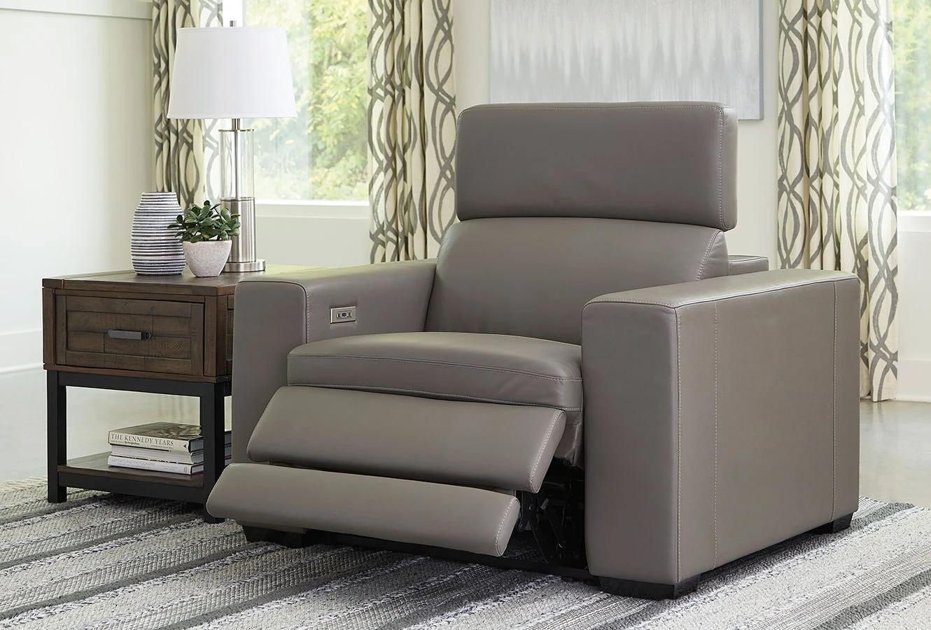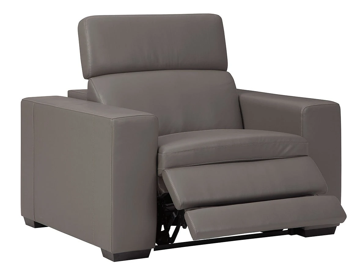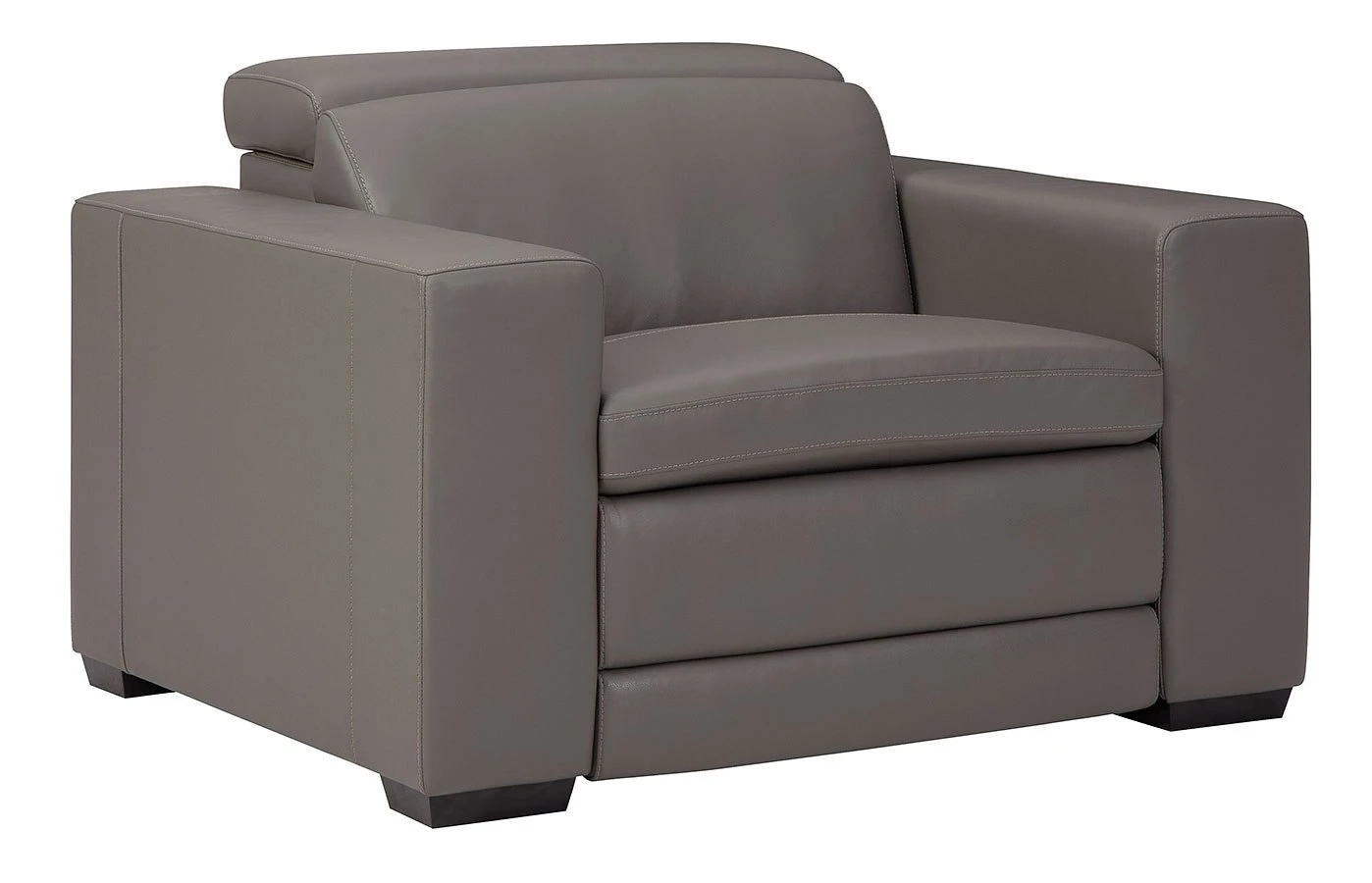 - OverviewTruly putting high design into recline, this Texline recliner in gray with genuine leather seating area proves that just because you’re a recliner doesn’t mean you have to look like one. Deceptively beautiful, its ultra clean-lined aesthetic is as cool and contemporary as they come. Low-profile back has a super swank look. When you need like more support for your head and neck, the press of a button engages the Easy View power adjustable headrest, designed to let you lean back and still have a primo view of the TV. And how’s this for attentive: a zero-gravity design that raises the ottoman height for better blood flow and indulgent pillow top seating an added layer of comfort.