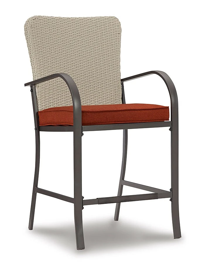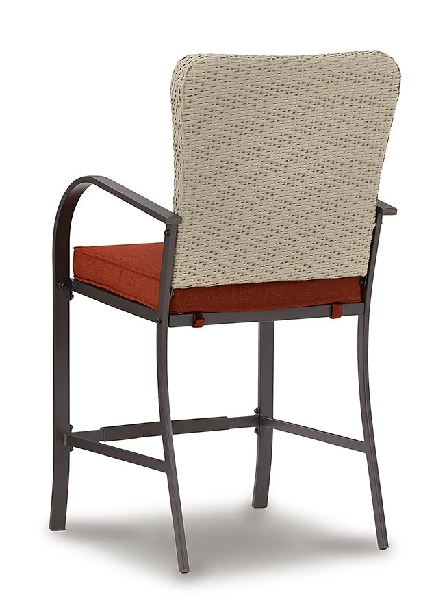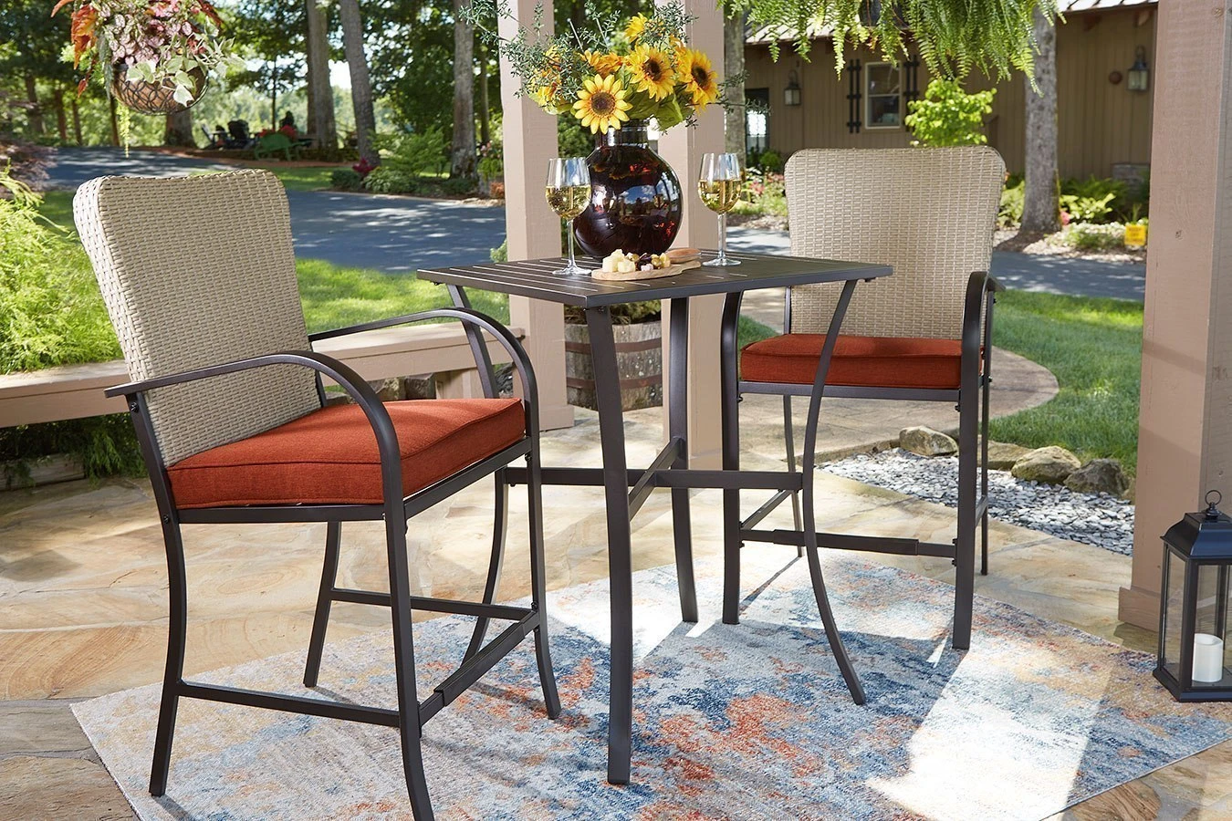 - OverviewMastering the art of outdoor living, this Tianna 3-Piece Counter Height Bistro Set by Signature Design raises the bar on al fresco dining. The striking ensemble sports wicker-woven resin over a powder coated heavy-duty steel frame to ensure seasons of satisfaction. The bar stools pamper with cushions wrapped in stylish, burnt orange high-performance Nuvella fabric for easy care and pleasing comfort.