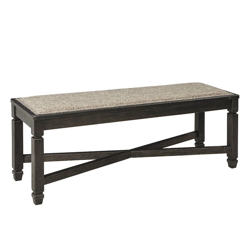 - OverviewInvite your family into the heart of your home with the Tyler Creek Bench by Signature Design. X-shape stretcher and tapered legs are a sturdy foundation. The black finish is beautifully textured. The heavily woven fabric has a quality feel-good touch. Silvertone nail head trim is decorative without all the fuss. This is trend-right urban farmhouse style.