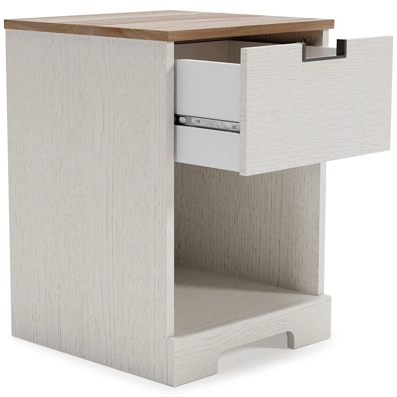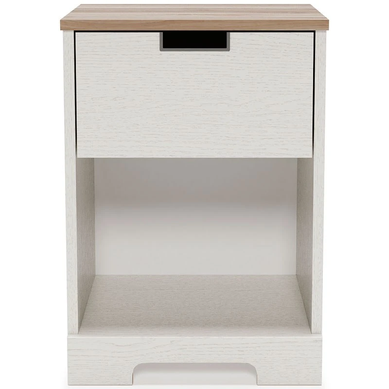 - OverviewFresh and inviting, this Vaibryn nightstand by Signature Design is truly versatile. A crisp white painted finish brings light to your room, while a warm brown finish accents the top. The nightstand’s open cubby offers additional beside storage. A smooth-gliding drawer with vinyl-wrapped sides and back for durability makes this piece a lively addition that will brighten your space in a snap.