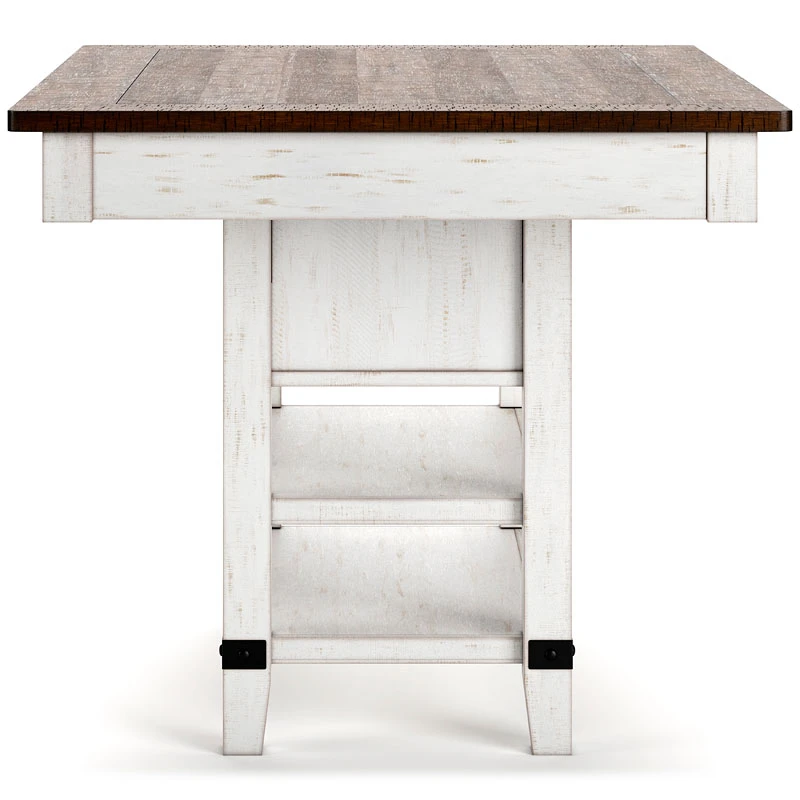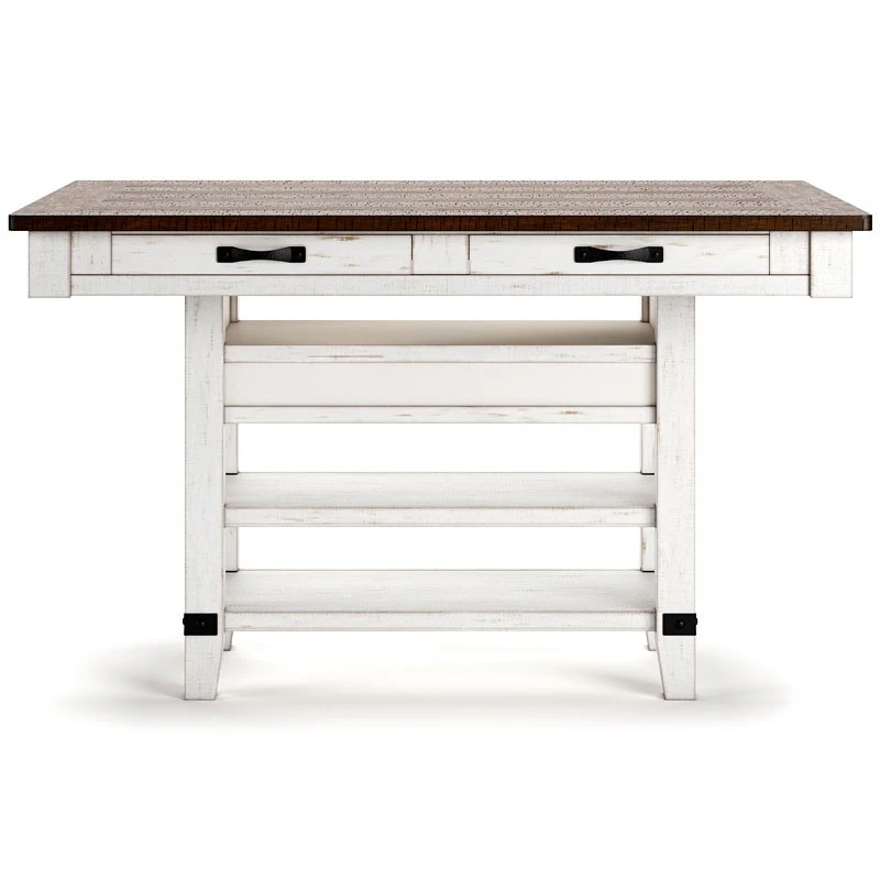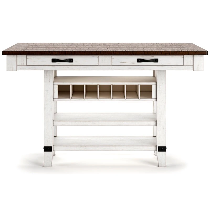 - OverviewA high-style choice for dining spaces, this Valebeck Counter Height Dining Table by Signature Design serves up the best in rustic farmhouse living. Its two-tone finish pairs a brown tabletop with a distressed vintage white base for a double helping of charm. The table features four storage drawers (two on each side), a seven-bottle wine rack and two open shelves for display. The sturdy post and bracket base design, with black metal accents and a thick dining top, lends an earthy appeal.