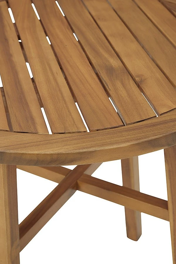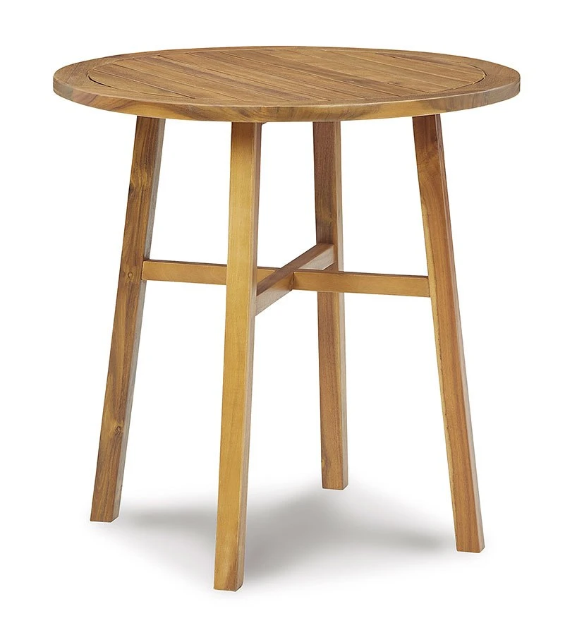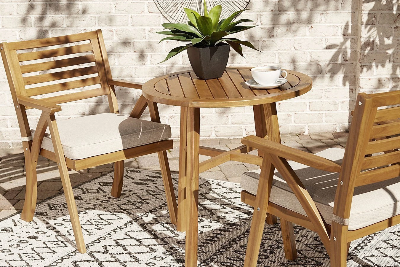 - OverviewTurn an outdoor space into your own private oasis with this Vallerie 3-Piece Outdoor Bistro Set by Signature Design. The essence of easy-breezy outdoor living, this brilliantly styled bistro set is quality crafted of acacia wood in a natural teak tone for an exotic element. Delightfully low-maintenance seat cushions wrapped in Nuvella fabric perfect the aesthetic.