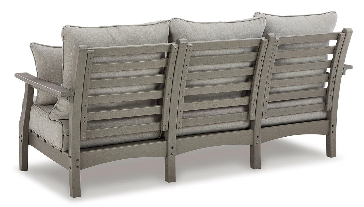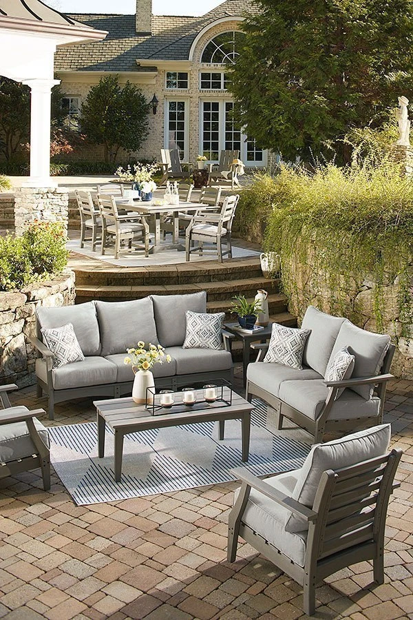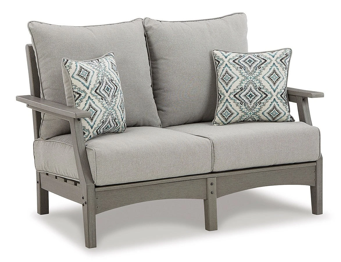 - OverviewIt’s the dawn of a new day for gray. Embrace the style trend with this Visola Outdoor Seating Set by Signature Design. Crafted of HDPE material that combines the exceptional durability and weather resistance you need with the “wood look” you love, this comfortably cushioned collection takes outdoor living to a whole new level. Rest assured, the thick seat and back cushions and throw pillows are wrapped in our exclusive Nuvella high-performance fabric that’s fade resistant, stain resistant and a breeze to clean.