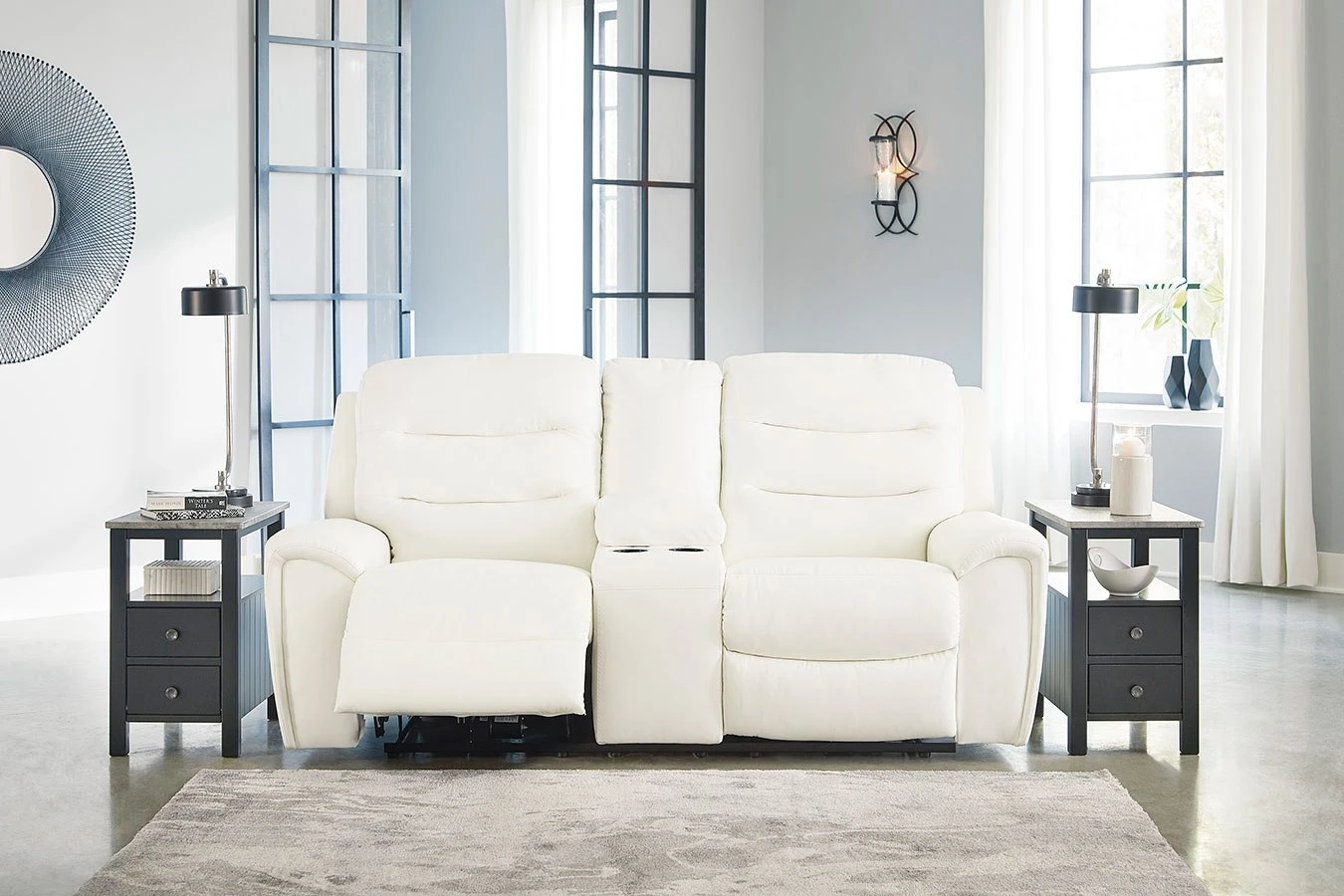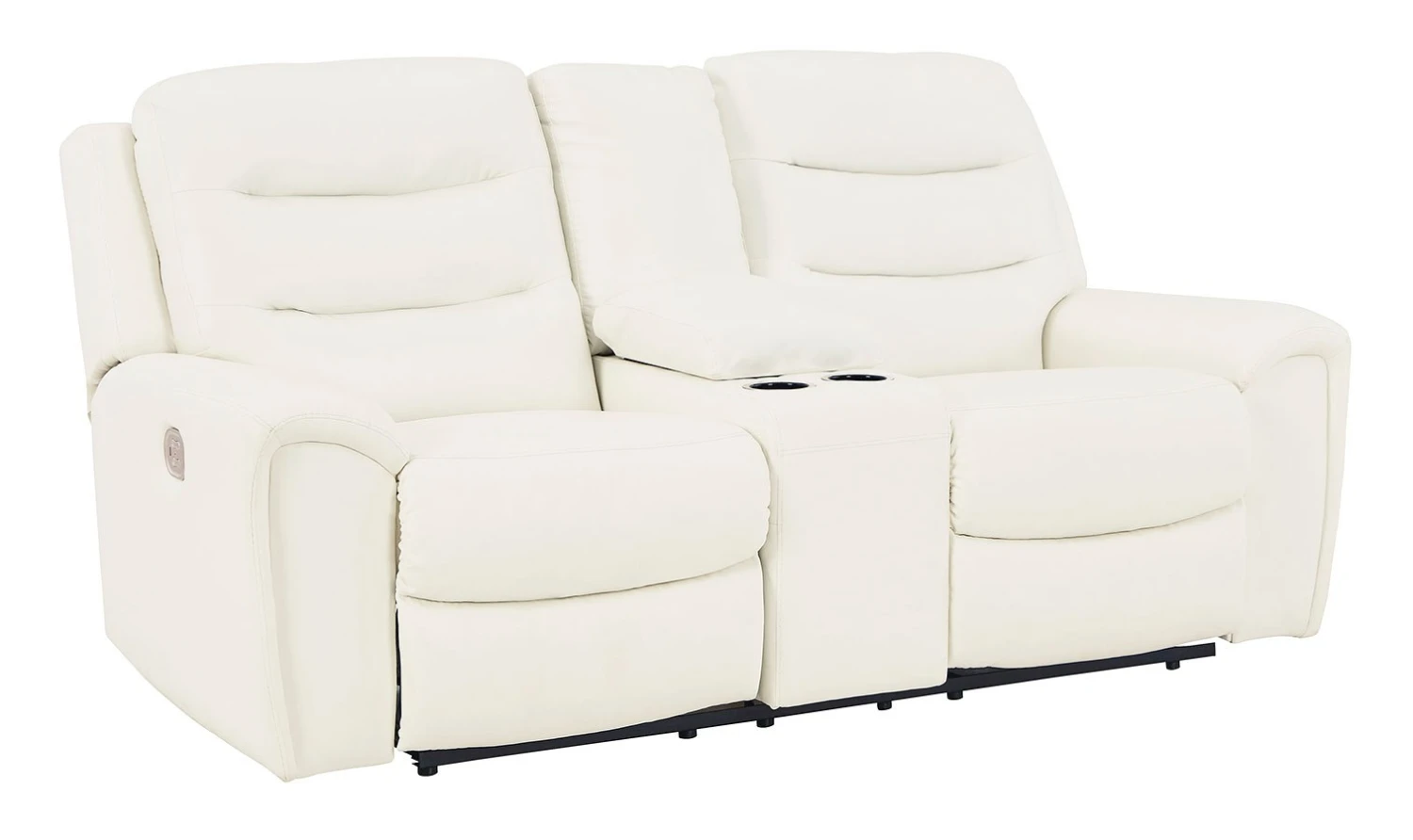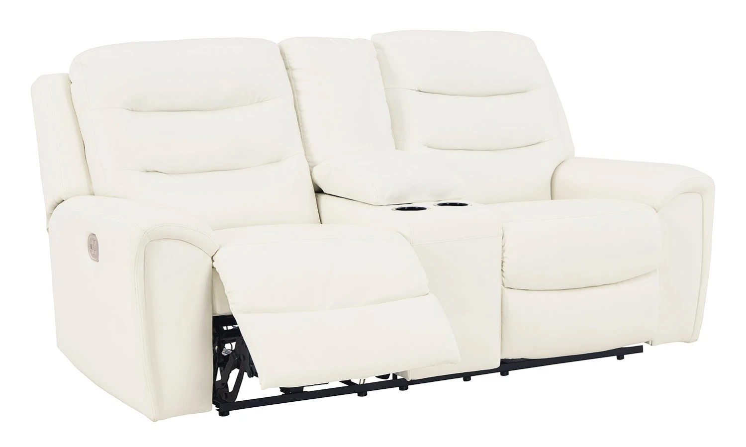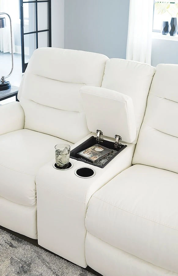 - OverviewWith its decidedly contemporary styling, this Warlin power reclining loveseat with console by Signature Design has a sleek sensibility that seamlessly elevates your living room’s style. Explore endless possibilities for comfort with its one-touch power control, zero-gravity reclining and adjustable headrests. A triple-tier back and chic white upholstery round out this simply stunning piece.
