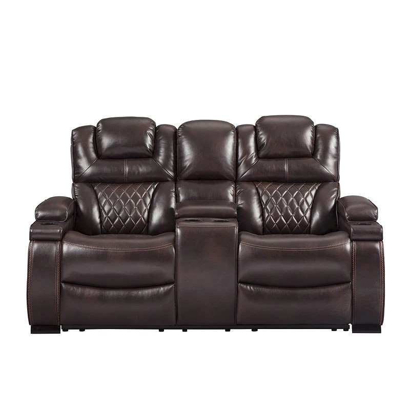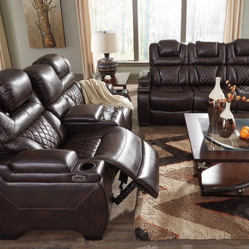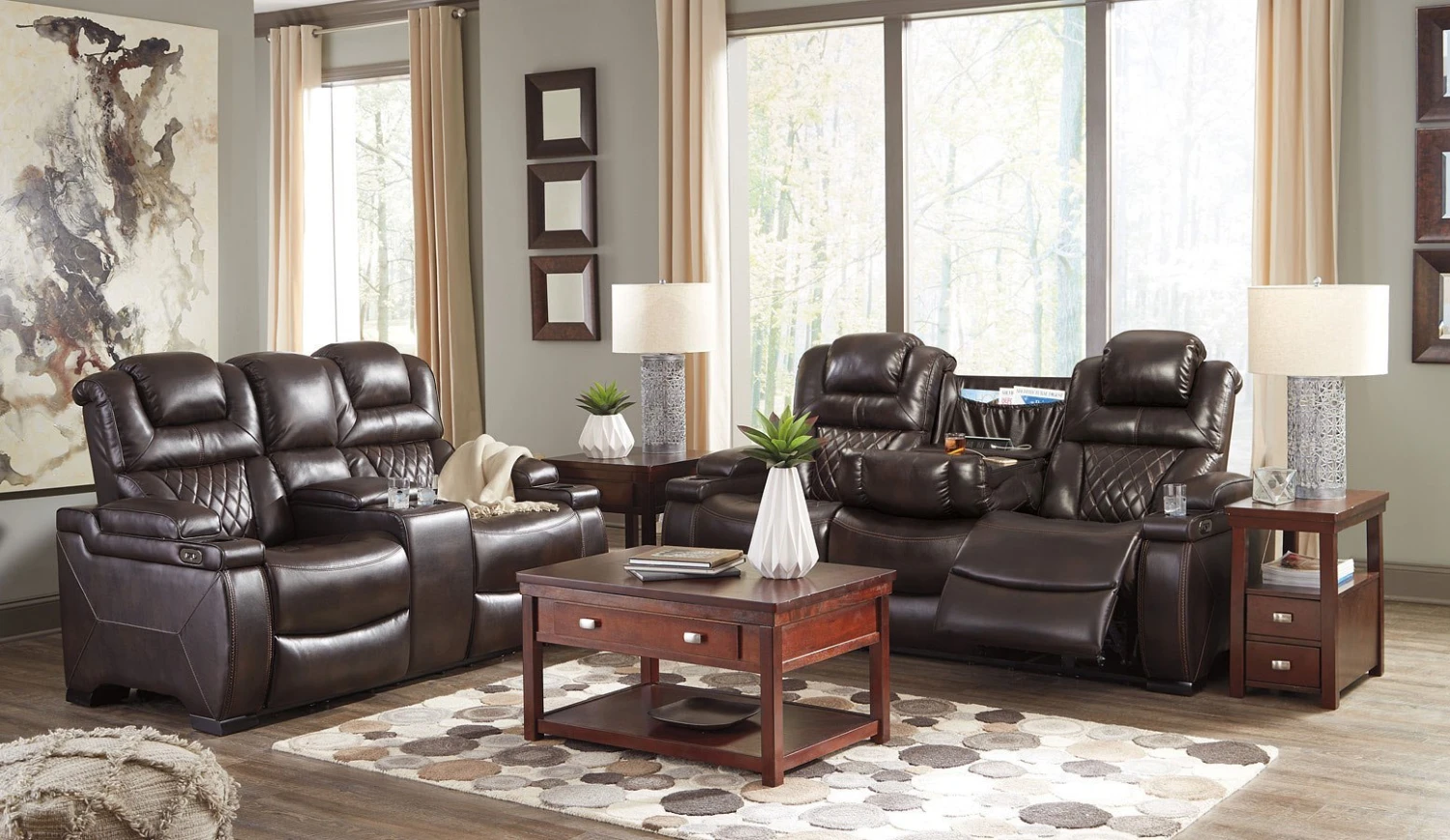 - Default Set Includes1 x Warnerton Chocolate Power Reclining Sofa w/ Adjustable Headrest 1 x Warnerton Chocolate Power Reclining Loveseat w/ Console and Adjustable Headrest