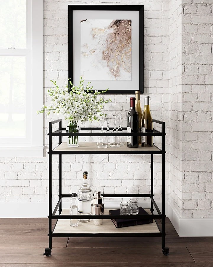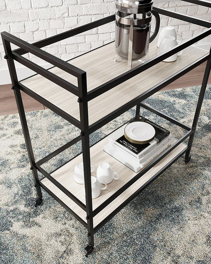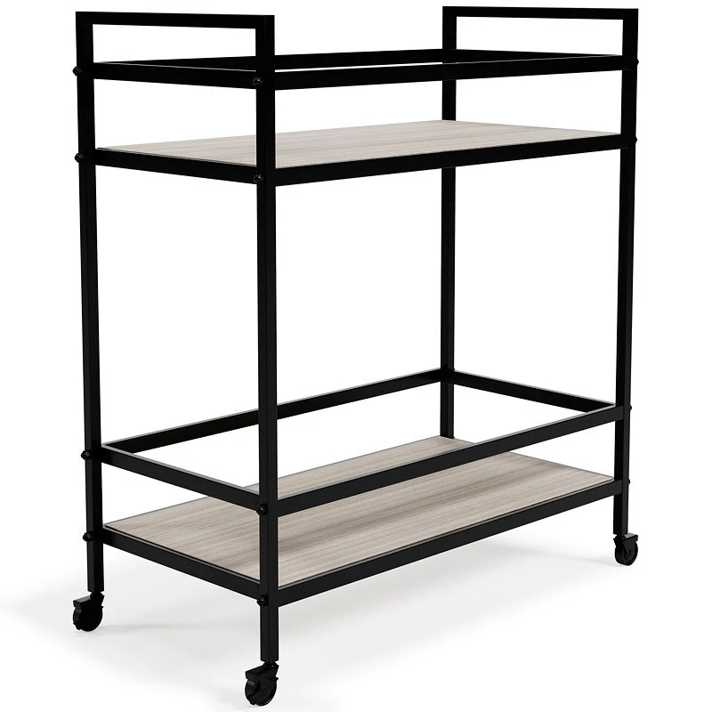 - OverviewThis Waylowe Bar Cart by Signature Design is constructed of metal in black finish and light tan wood grain effect melamine.