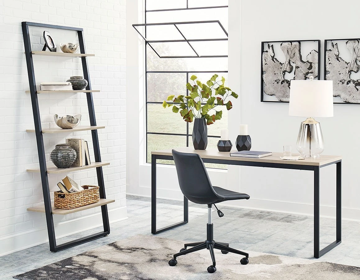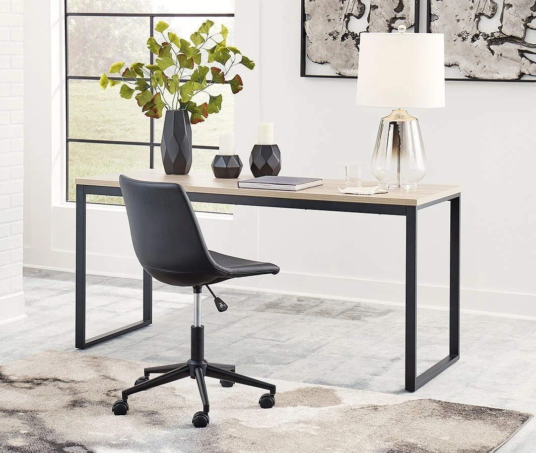 - OverviewContemporary meets casual for the ultimate office space. This Waylowe Desk by Signature Design aims to please with its durable melamine top and metal base in a powder coat finish. The top features a replicated exotic wood grain in a light tan finish, making this versatile piece perfect for your workspace. DURA TUFF surfaces are made of easy-clean melamine which is heat-, scratch- and water-resistant.