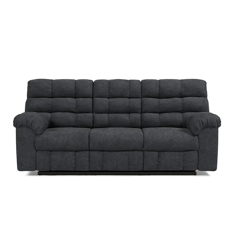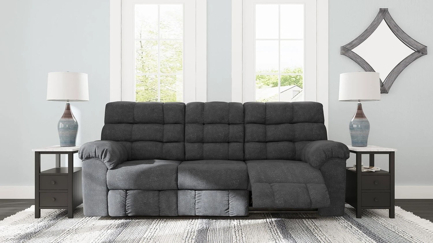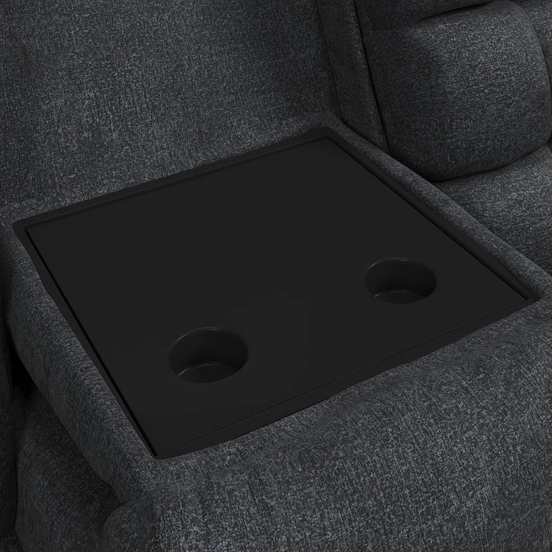 - OverviewEmbrace ultimate comfort and style with this Wilhurst reclining sofa with drop-down table with cup holders for added functionality. Covered in a feel-good blue-gray fabric beautified with puckered stitching and biscuit-back tufting, this quality reclining sofa entices with generously stuffed armrests that make it that much more of a dream scene.