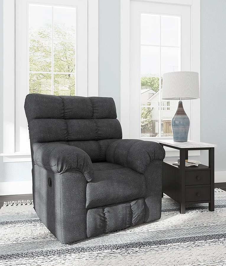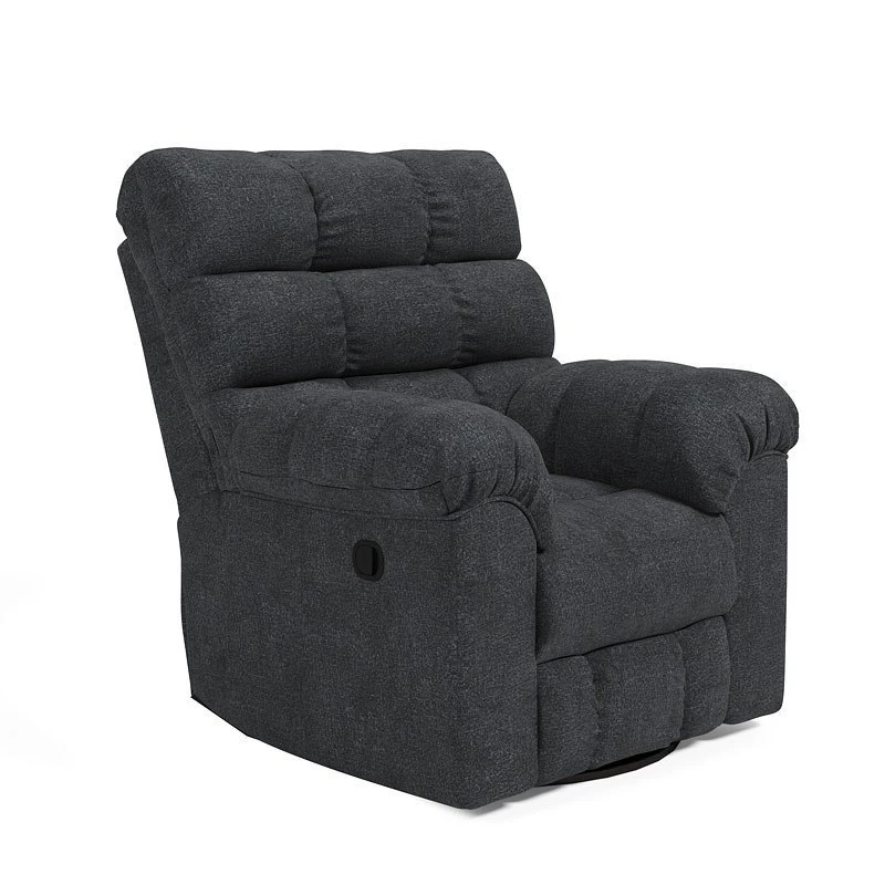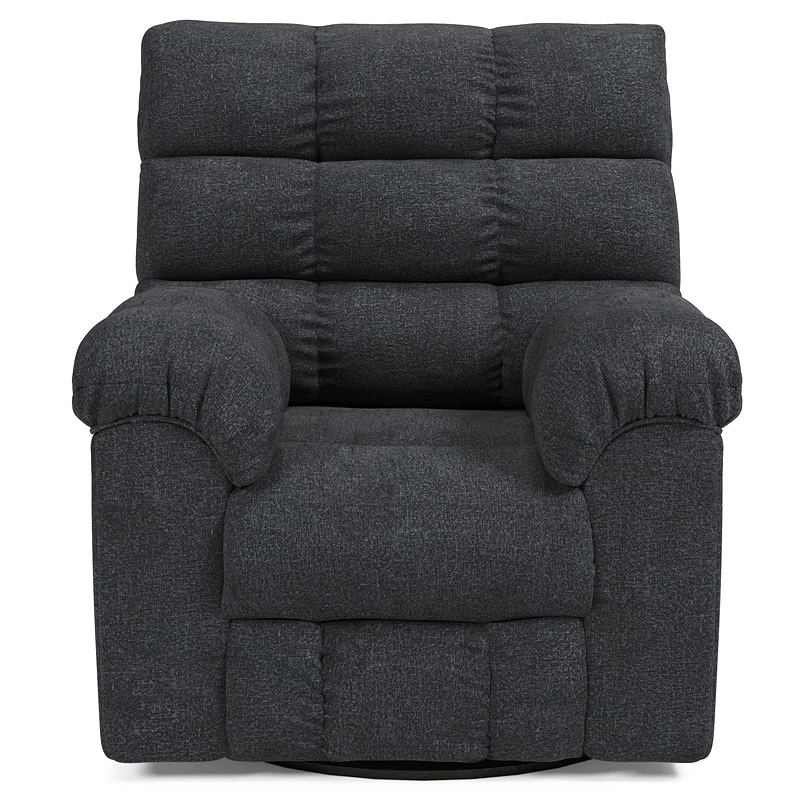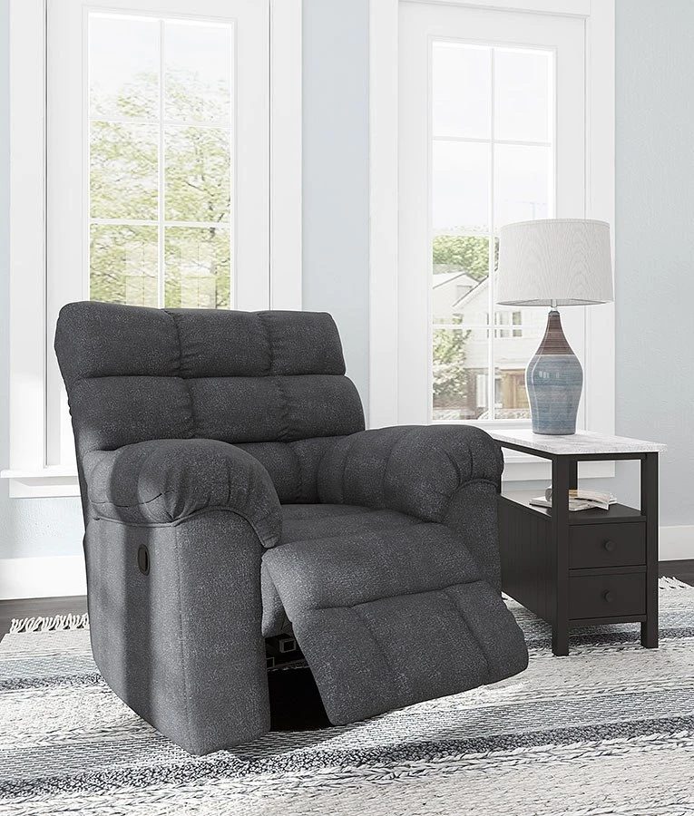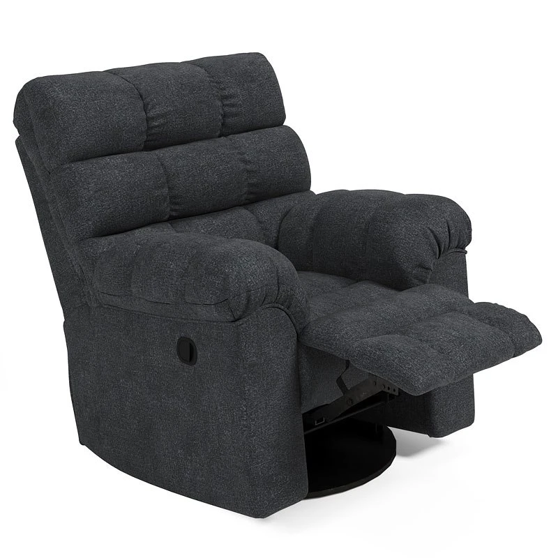 - OverviewTake ultimate comfort and style for a spin with this Wilhurst swivel rocker recliner in soothing blue-gray. Covered in a feel-good fabric beautified with puckered stitching and biscuit-back tufting, this quality recliner is set on a sturdy swivel, so you’ll always be in the flow of conversation. Generously stuffed armrests make it that much more of a dream scene.