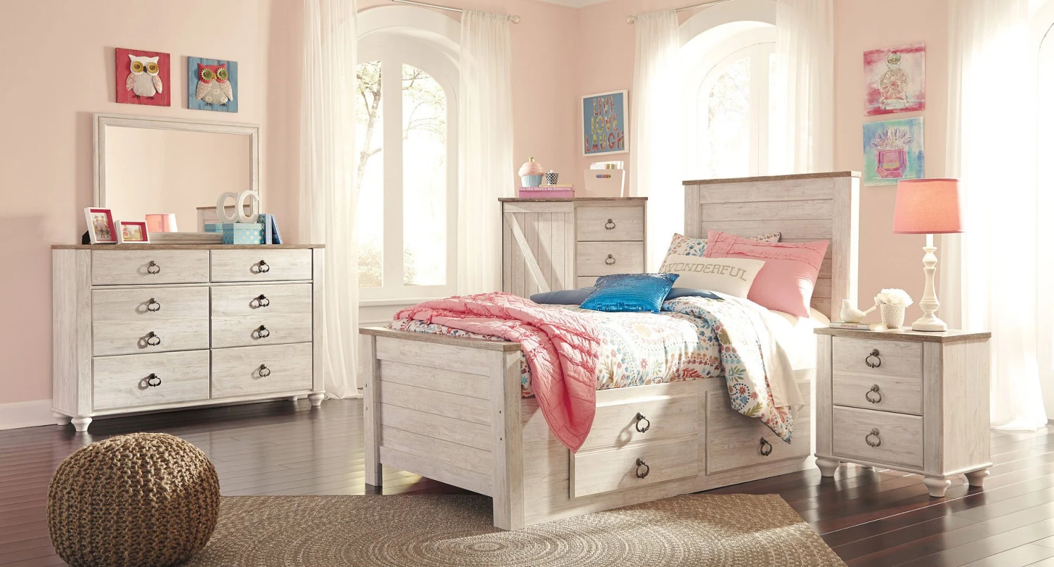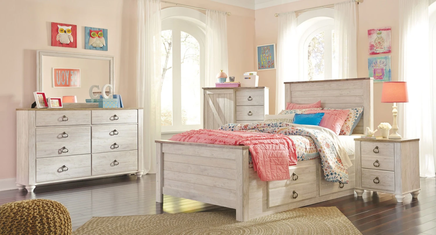 - OverviewThe ultimate look for a beach cottage or shabby chic inspired retreat, the Willowton Youth Storage Bedroom Set by Signature Design carries you away to a dreamy time and place. Driftwoody whitewashed finish is wonderfully easy on the eyes. Plank-style detailing incorporates a classically rustic touch, so homey and comforting.