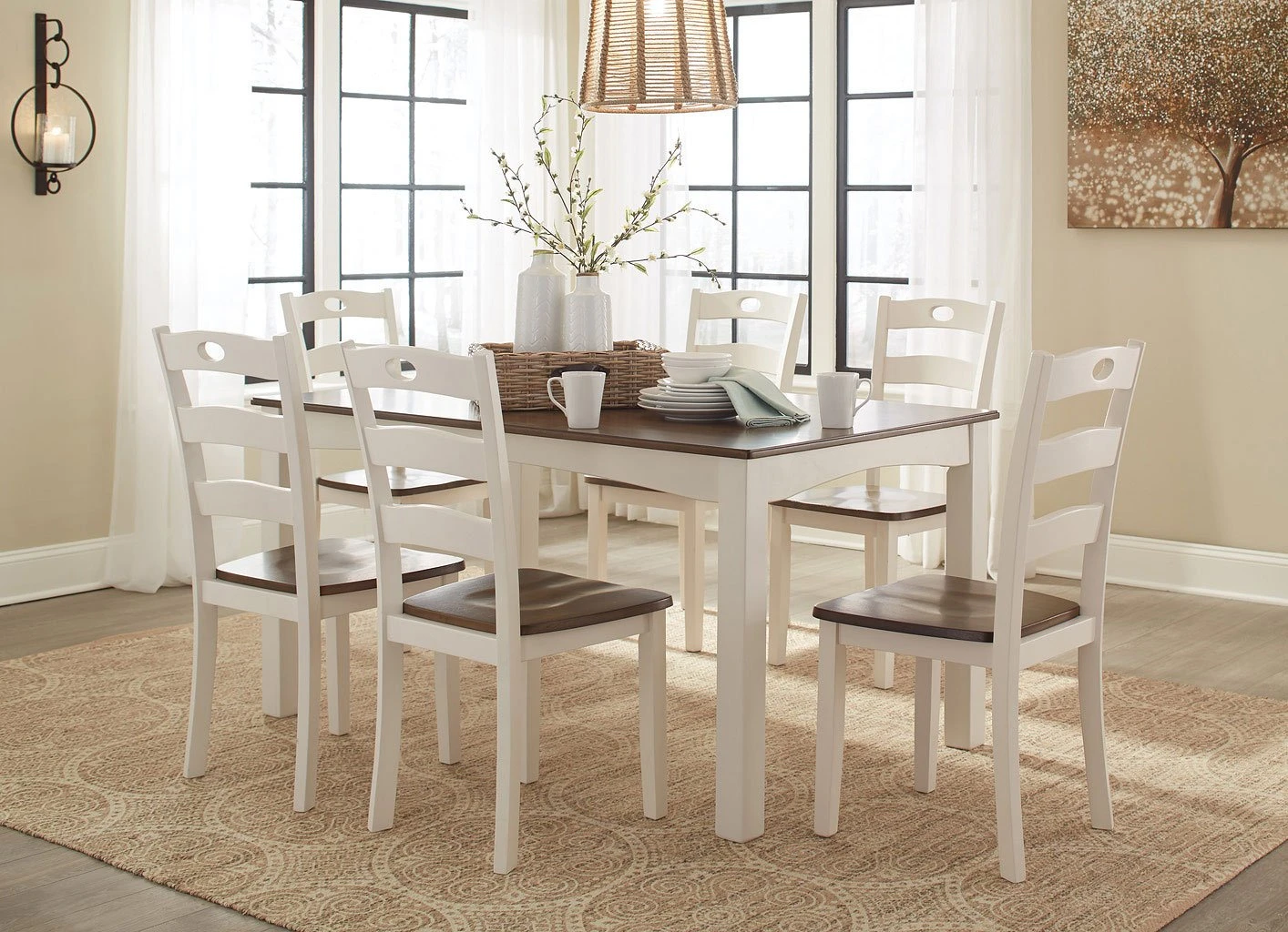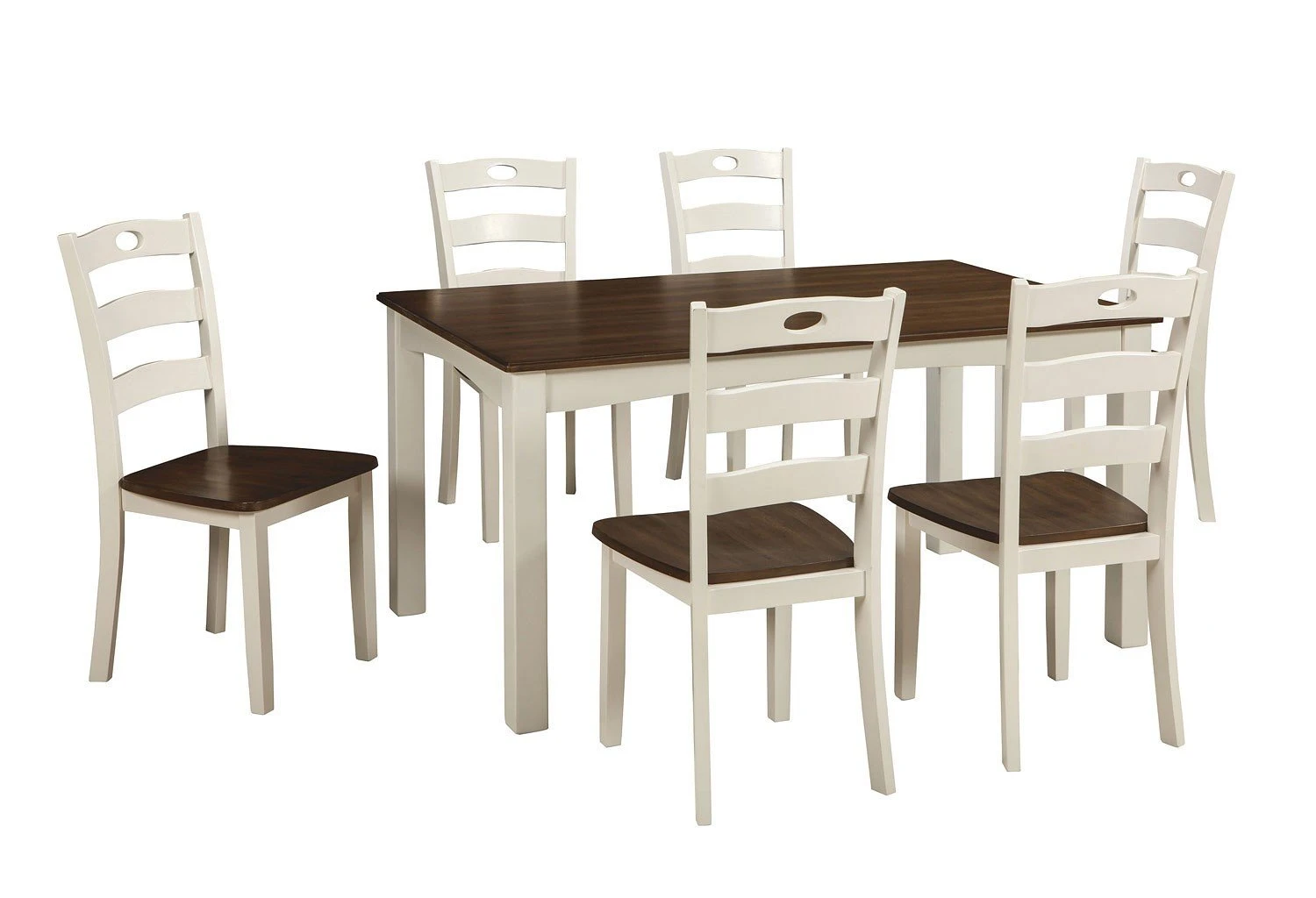 - OverviewTurn your eat-in kitchen or dining room into a cottage-chic retreat with the Woodanville 7-Piece Dining Room Set by Signature Design. Distinctive elements include a two-tone finish for a double helping of charm and shapely arched aprons. Six pierced ladderback dining chairs with contoured seats beautifully accommodate.