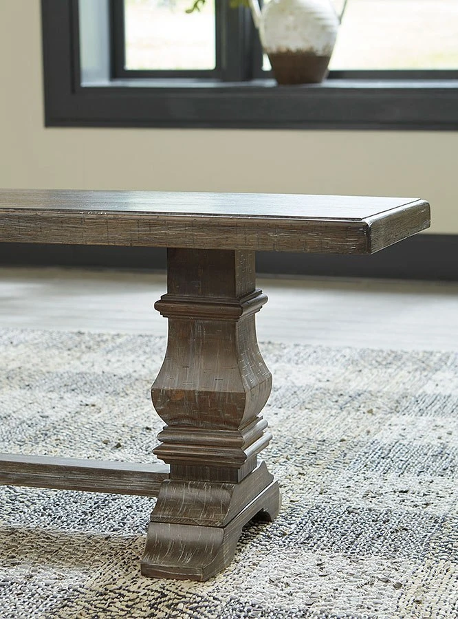 - OverviewInspired by heavy and hearty lodge-style furnishings from days gone by, the Wyndahl dining room set by Signature Design brings the past brilliantly into the present. Enhancing the robust look and feel: a thick edge extension table top sits on sturdy double pedestal base and can seat 6-8. Enticing with a distressed aged pine color finish with light wire-brushed texture, this table is reserved for those who appreciate furniture with great presence.