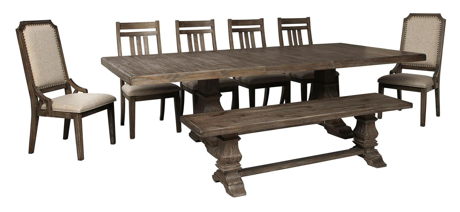 - Default Set Includes1 x Wyndahl Dining Table 2 x Wyndahl Side Chair 2 x Wyndahl Upholstered Chair 1 x Wyndahl Bench